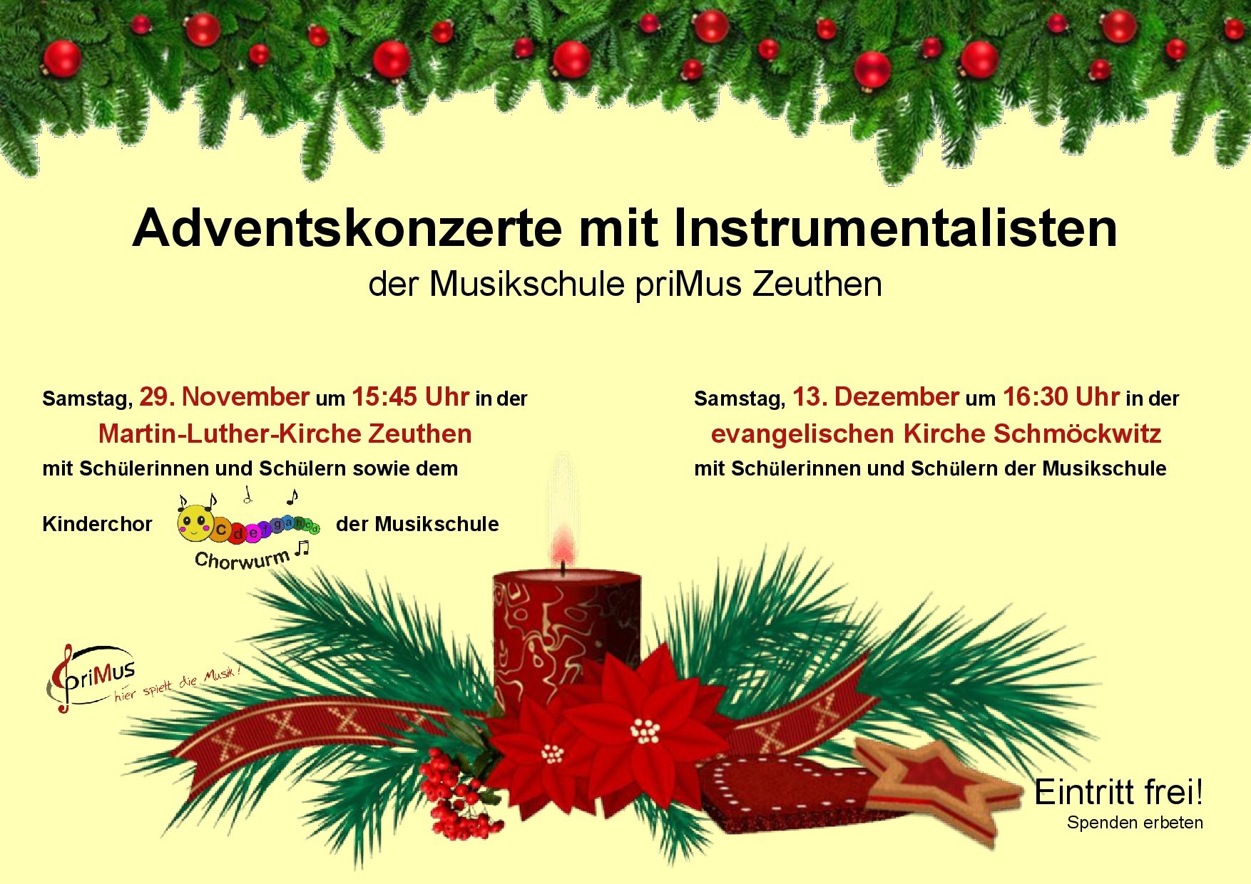 Es ist Tradition, dass am Nachmittag vor dem 1. Advent im Rahmen des Weihnachtsmarktes Zeuthen die Musikschule priMus Zeuthen ihr Adventskonzert in der Martin-Luther-Kirche gestaltet. Schon im letzten Jahr waren es sogar zwei Konzerte, so wird es auch in diesem Jahr sein.