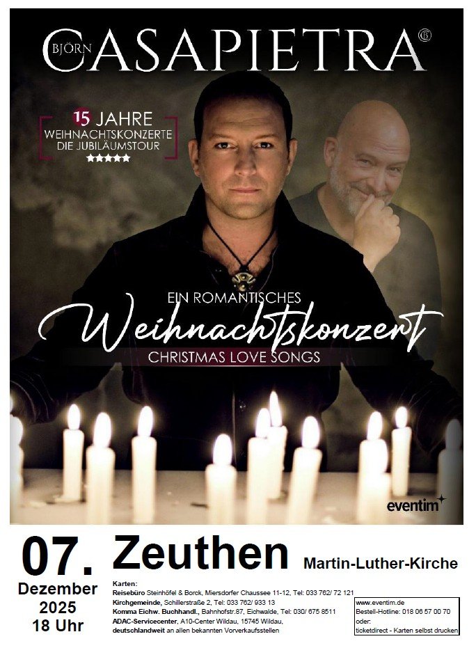 „Ich fühle mich im Augenblick wie ein Stier, der vor einem roten Tuch steht - motiviert bis unter die Haarspitzen.“ Mit Besinnlichkeit, aber auch leidenschaftlich und temperamentvoll möchte Björn Casapietra in seinen Weihnachtskonzerten die freudvollste Zeit des Jahres 2025 gemeinsam mit seinem Publikum erleben, so wie bei seinen, mittlerweile im 16. Jahr gefeierten „Christmas Love Songs“, die er in ausverkauften Kirchen und Theatern u.a. in Leipzig, Wismar, Stralsund, Potsdam, Münster und Berlin feierte.