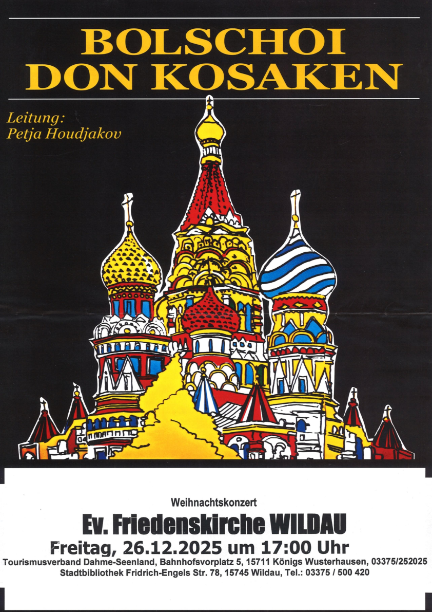 Erleben Sie die Bolschoi Don Kosaken mit ihren unglaublichen Stimmen am 2. Weihnachtsfeiertag in der Friedenskirche Wildau. Leitung: Prof. Petja Houdjakov.