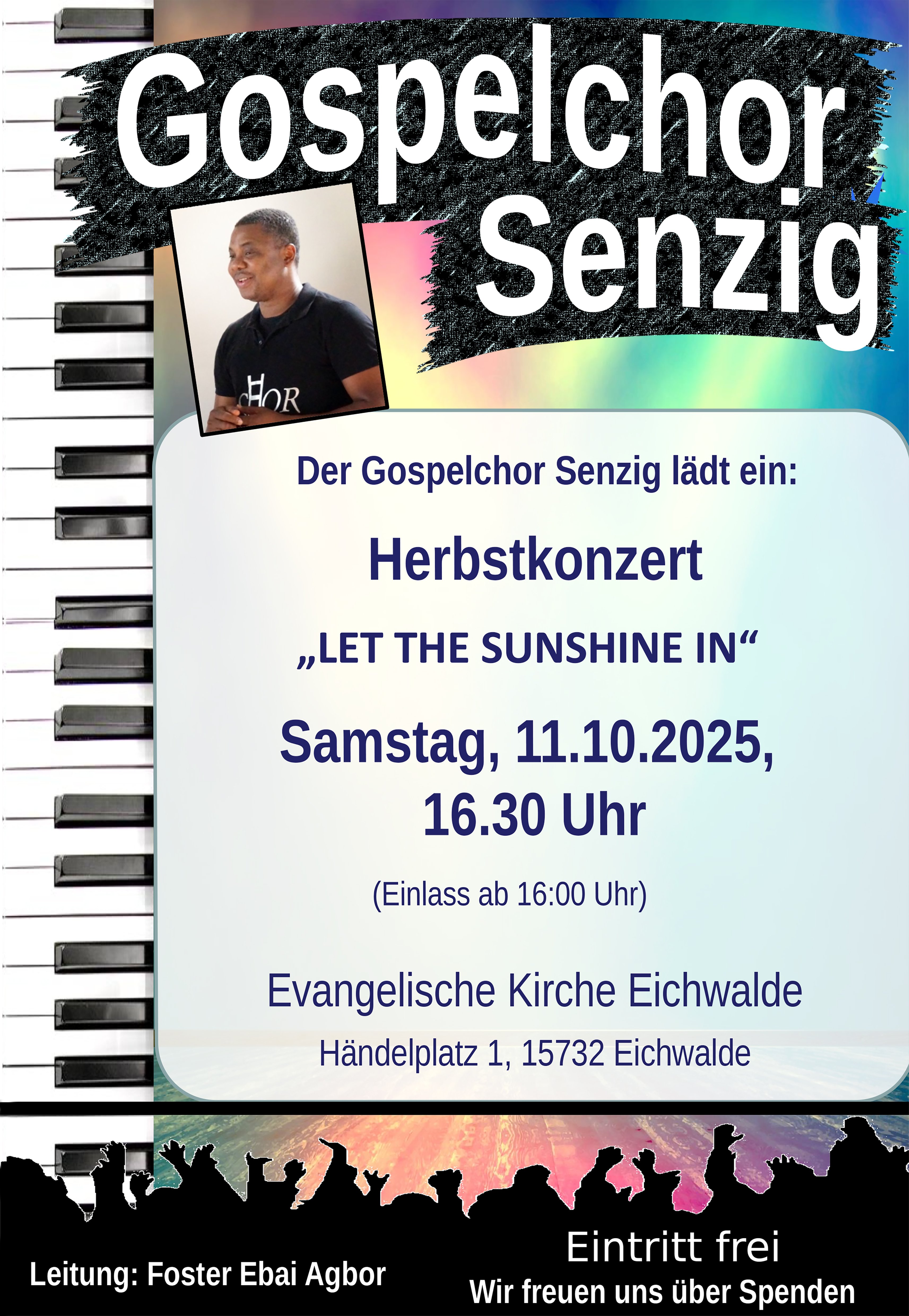 Der Gospelchor der evangelischen Lukas-Kirchengemeinde Senzig unter Leitung von Foster Agbor lädt Sie herzlich zu seinem Herbstkonzert nach Eichwalde ein. Unser diesjähriges Motto „Let the Sunshine in“ mit dem gleichnamigen Song aus dem Musical „Hair“ fordert dazu auf, den Sonnenschein des Herbstes in die Häuser und Herzen zulassen, dunkle Zeiten zu überwinden und das Leben zu feiern.