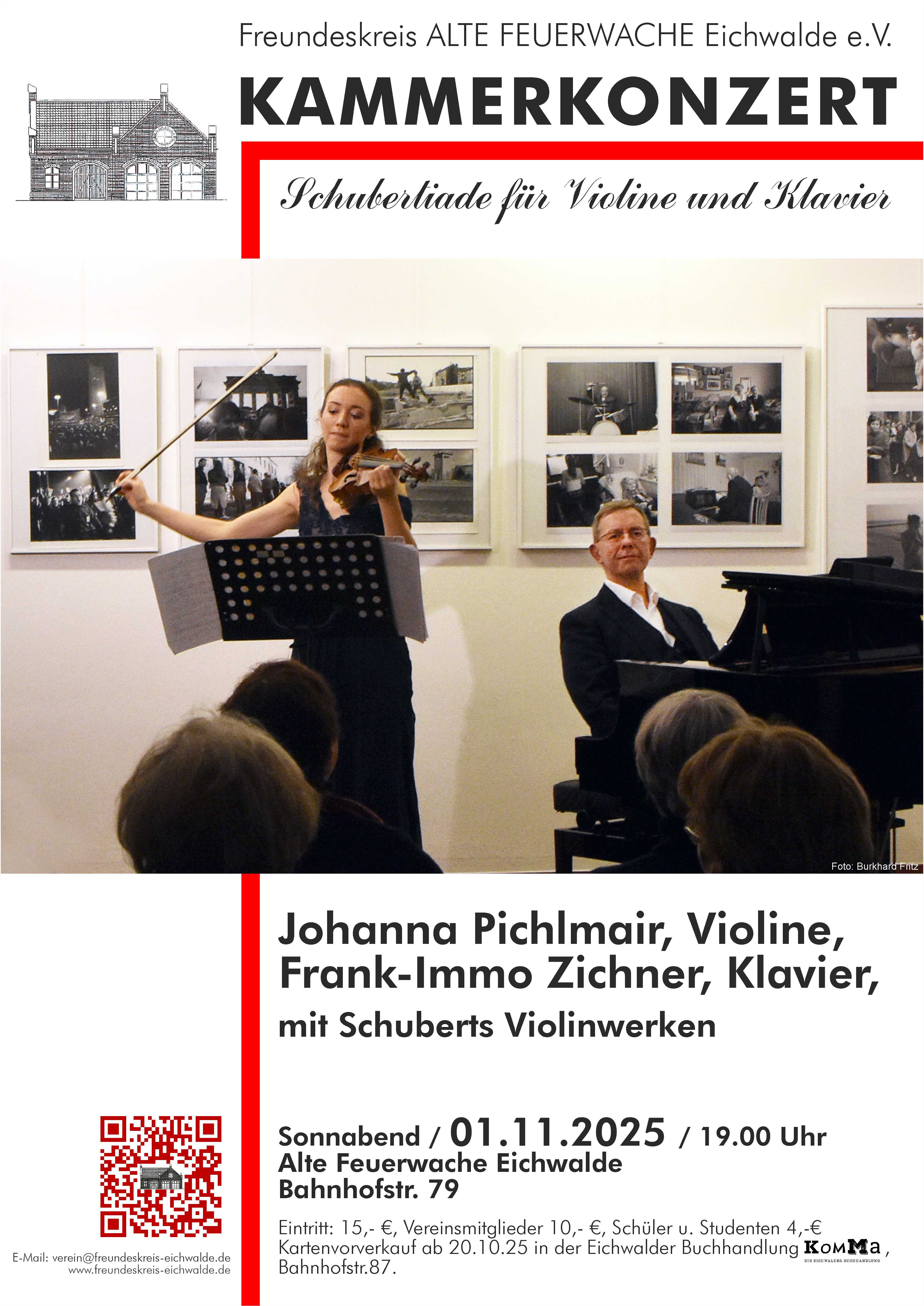 „Schubertiade für Violine und Klavier“ haben die beiden Künstler das Kammerkonzert am Sonnabend, dem 1.11.2025, im Eichwalder Kulturzentrum Alten Feuerwache überschrieben. Die Violinistin Johanna Pichlmair, begleitet am Klavier von Frank-Immo Zichner, haben ausschließlich Werke von Franz Schubert im Programm. Das Konzert beginnt um 19 Uhr. Karten zu 15,- € gibt es im Vorverkauf ab dem 20.10. in der Eichwalder Buchhandlung KOMMA oder an der Abendkasse. Vereinsmitglieder zahlen 10,- €, Schüler und Studenten 4,- €. Veranstaltet wird das Konzert vom Freundeskreis ALTE FEUERWACHE Eichwalde e.V. Siehe auch: www.freundeskreis-eichwalde.de