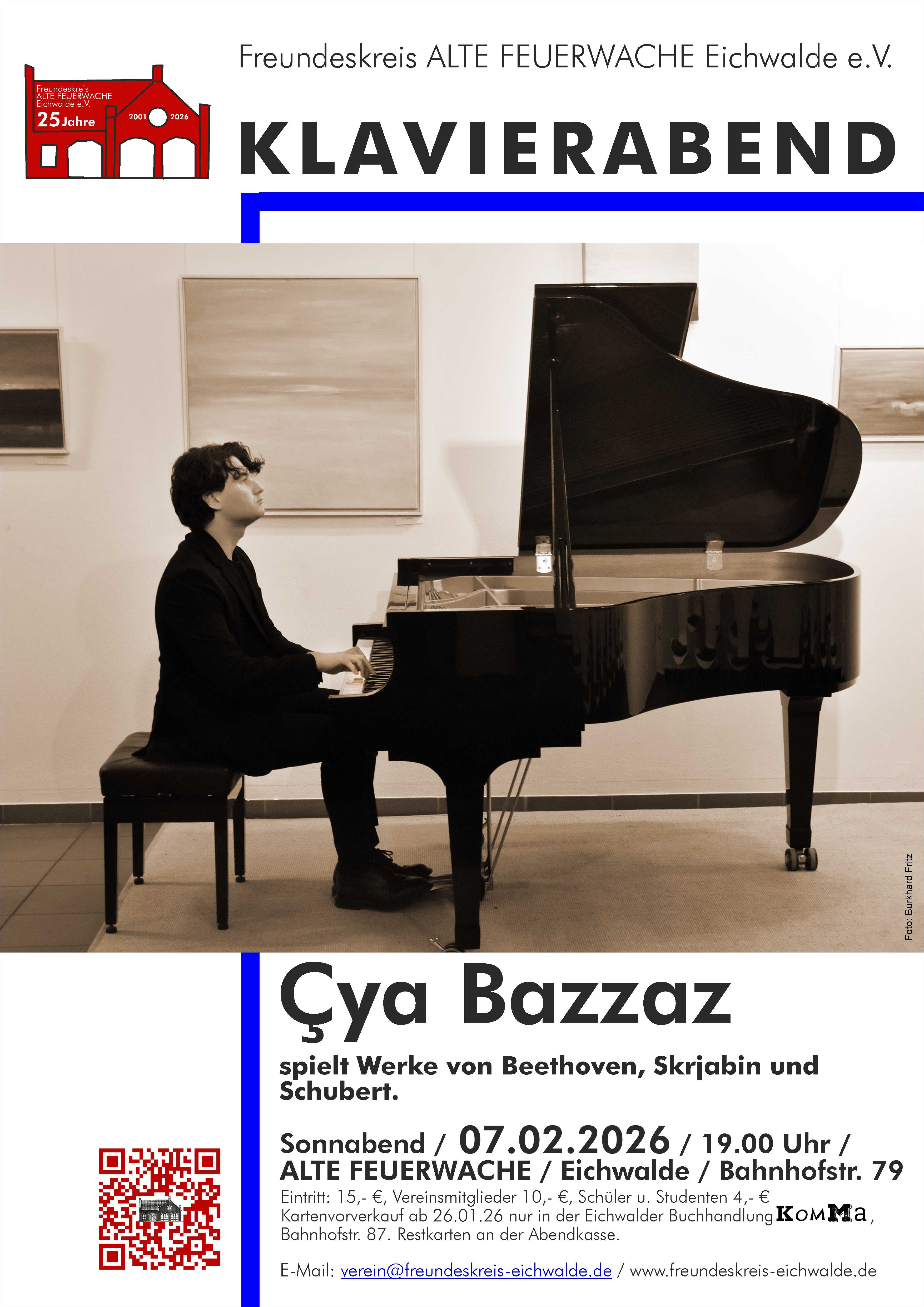 Am Sonnabend, dem 07.02.2026, gastiert der Pianist Çya Bazzaz im Eichwalder Kulturzentrum Alte Feuerwache in der Bahnhofstraße 79. Auf dem Programm stehen Werke von Ludwig van Beethoven, Alexander Skrjabin und Franz Schubert. Beginn ist um 19.00 Uhr. Veranstaltet wird das Konzert vom Freundeskreis ALTE FEUERWACHE Eichwalde e.V., der in diesem Jahr sein 25. Gründungsjubiläum feiert. Karten gibt es im Vorverkauf in der Eichwalder Buchhandlung KOMMA oder an der Abendkasse zum Preis von 15,- €. Vereinsmitglieder zahlen 10,- €, Schüler und Studenten 4,- €.