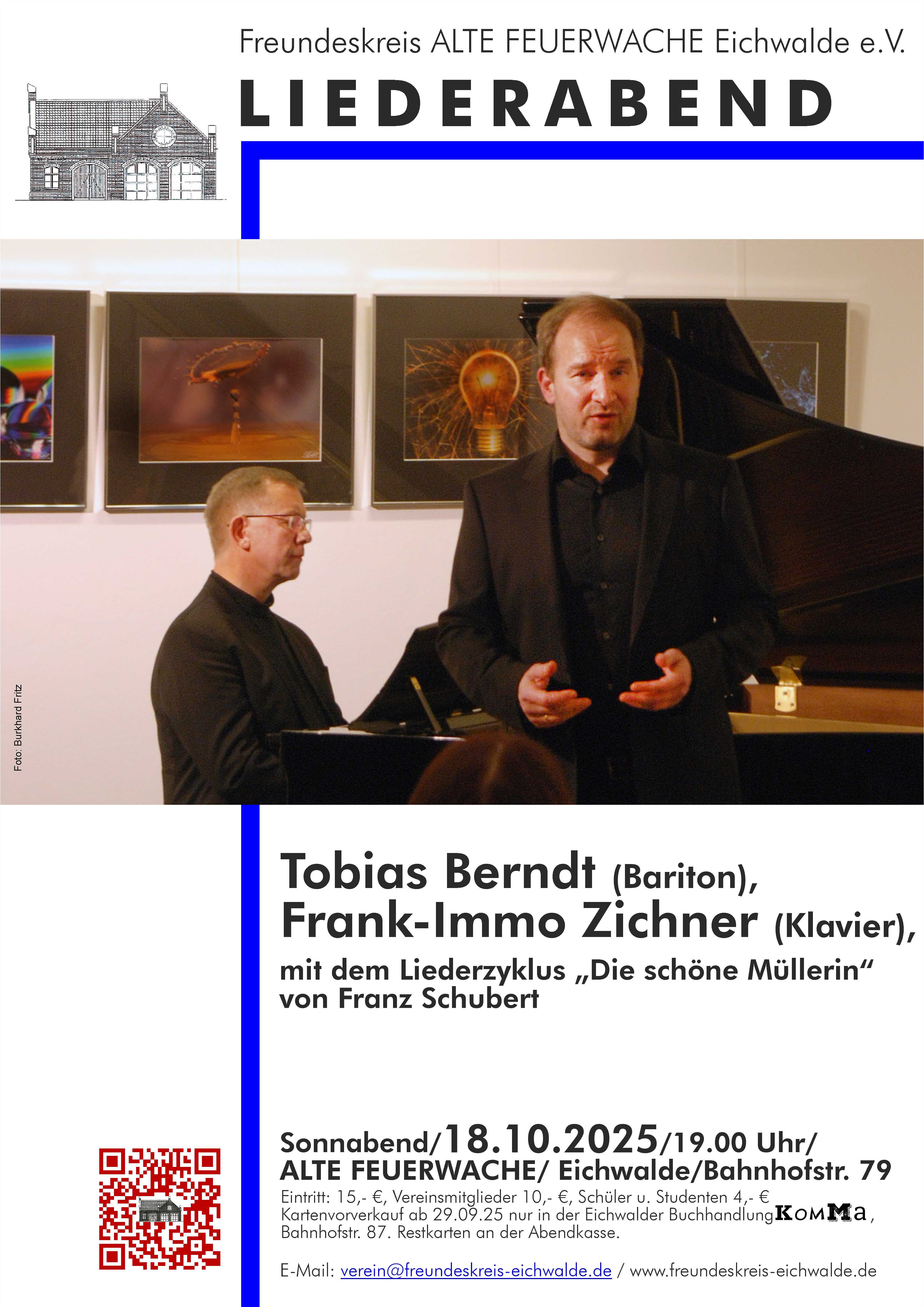 Am Sonnabend, den 18.10.2025, präsentiert der Freundeskreis ALTE FEUERWACHE Eichwalde e.V. im Eichwalder Kulturzentrum in der Bahnhofstr. 79 einen Liederabend. Auf dem Programm steht der Liederzyklus „Die schöne Müllerin“ von Franz Schubert, gesungen vom Bariton Tobias Berndt. Am Flügel begleitet ihn Frank-Immo Zichner.