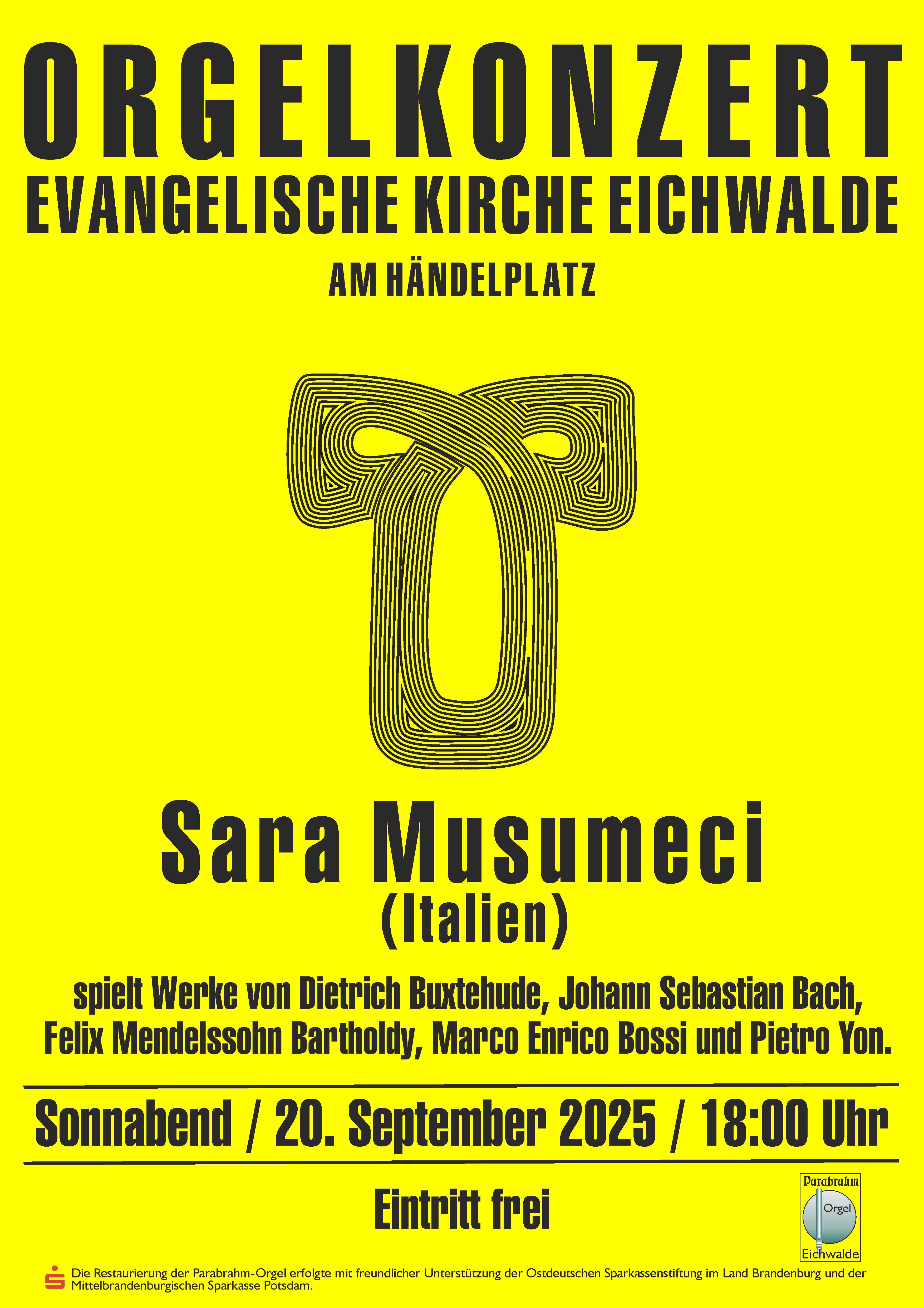 Am Sonnabend, dem 20.09., gibt die italienische Organistin Sara Musumeci ein Konzert auf der Parabrahm-Orgel aus dem Jahr 1908 in der evangelischen Kirche am Händelplatz. Auf dem Programm stehen Werke von Dietrich Buxtehude, Johann Sebastian Bach, Felix Mendelssohn Bartholdy, Marco Enrico Bossi und Pietro Yon.