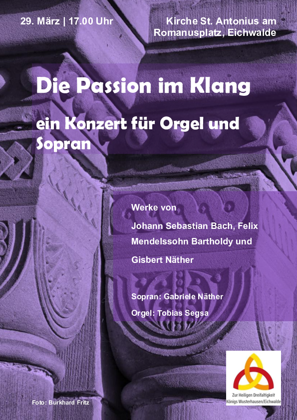 Die Passion im Spiegel der Musik vom Barock bis in die Moderne. Gönnen Sie sich am Palmsonntag eine Stunde der Inspiration in der Klangwelt der Passion. Erleben Sie die Sopranistin Gabriele Näther und unseren Pfarreikirchenmusiker Tobias Segsa an unserer neuen Orgel in St. Antonius am Romanusplatz.