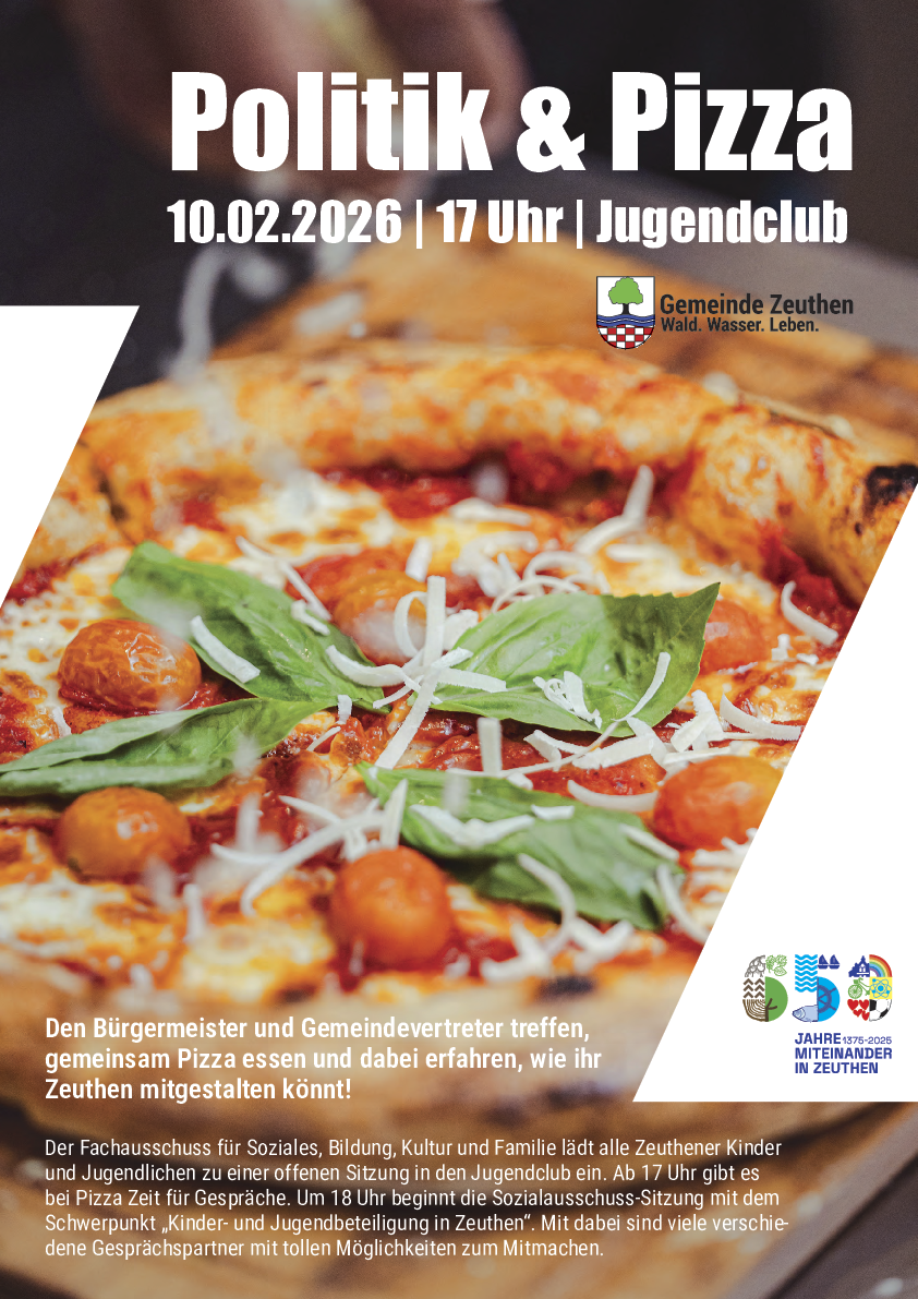 Der Fachausschuss für Soziales, Bildung, Kultur und Familie lädt alle Zeuthener Kinder und Jugendlichen zur ersten Sitzung des neuen Jahres am Dienstag, 10.02.2026 in den Jugendclub Zeuthen ein. Gemeinsam wollen wir ab 17 Uhr selbstgebackene Pizza aus dem Steinofen genießen und dabei drinnen und draußen ins Gespräch kommen. Um 18 Uhr startet dann der Sozialausschuss mit dem Schwerpunkt „Kinder- und Jugendbeteiligung in Zeuthen“. Mit dabei sind viele Gesprächspartner mit ganz unterschiedlichen Möglichkeiten zum Mitmachen.
