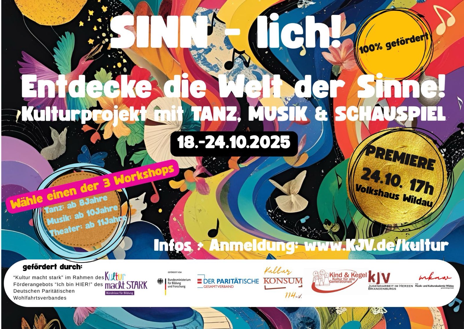 Unter dem diesjährigen Motto “SINN-lich” – Entdecke die Welt der Sinne!, geht unser Projekt “Kultur macht stark” in die nächste Runde. Vom 18. – 24.10.2025 könnt Ihr auch dieses Mal dabei sein und an einem Workshop (Tanz, Musik oder Schauspiel) teilnehmen. Wie immer sind unsere erfahrenden Coaches am Start und haben sich ein buntes, erlebnisreiches und vielfältiges Programm überlegt.