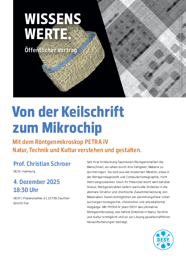 Seit ihrer Entdeckung faszinieren Röntgenstrahlen die Menschheit, vor allem durch ihre Fähigkeit, Materie zu durchdringen. Sie sind aus der modernen Medizin, etwa in der Röntgendiagnostik und Computertomographie, nicht mehr wegzudenken. Doch ihr Potenzial reicht weit darüber hinaus: Röntgenstrahlen liefern wertvolle Einblicke in die atomare Struktur und die chemische Zusammensetzung von Materialien. Damit ermöglichen sie zerstörungsfreie Untersuchungen biologischer, chemischer und physikalischer Vorgänge. Mit PETRA IV plant DESY das ultimative Röntgenmikroskop, das tiefere Einblicke in Natur, Technik und Kultur ermöglicht und so zur Lösung gesellschaftlicher Herausforderungen beiträgt.